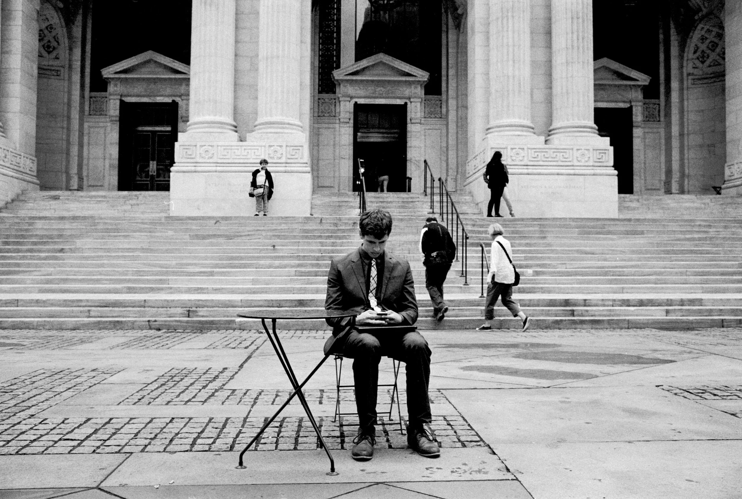 A man sits alone at a metal table staring into his mobile phone. He is sitting on the steps of the New York City public library. He is dressed in a suit, tie and smart shoes. Is he waiting for someone, is he early for an interview or meeting or is he just taking some time out?